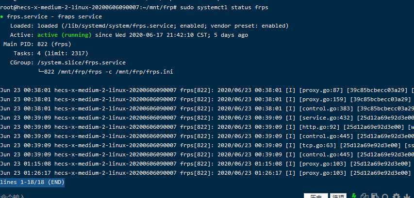 如果要查看应用的日志,可以输入,sudo systemctl status frps
