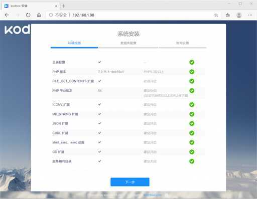 2、解压完毕后,先重启下树莓派,执行命令 sudo reboot ,待树莓派重启成功后,再我们的浏览器输入我们配置的ip地址,这里我的ip局域网地址为192.168.43.73,也可以使用配置的公网ip地址或二级域名都可以,就进入到可道云检测配置的界面,这里由于我已经配置好了,就使用大佬的截图来示范: