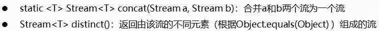 // 1.取出list的前四个数据组成一个流,然后跳过list前两个数据,取出剩下的元素组成一个流 Stream<String> stream1 = list.stream().limit(4); Stream<String> stream2 = list.stream().skip(2); // 2.合并上面两个流并打印出来 Stream.concat(stream1,stream2).forEach(System.out::println); // 3.合并步骤一的两个流,并打印出来,要求输出的字符串不能重复 Stream.concat(stream1,stream2).distinct().forEach(System.out::println);