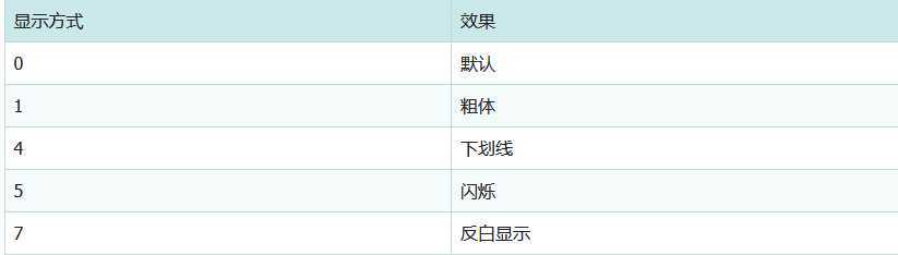 其中,显示方式、前景色、背景色都是可选参数(可缺省一个或多个)。