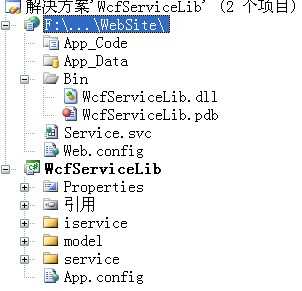 2、建立起来的新的WCF服务站点中在App_Code文件中自动为我们生成两个类文件:IService.cs和Service.cs。这两个文件对我们来说没有用,我们删掉。