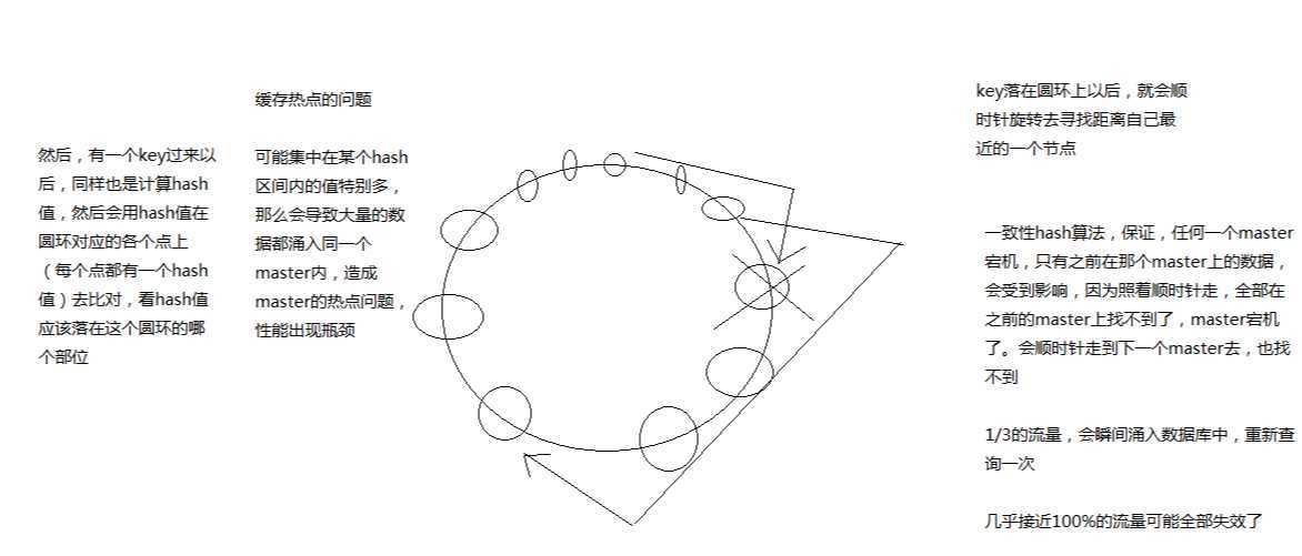 一致性 hash 的严重问题是缓存热点,关键字是 区间,因为它是一个环,顺时针找可用节点,所以只要节点够多,就能更均匀的均衡负载。