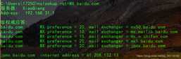 在命令行下可以通过 nslookup -qt=mx baidu.com 来查看MX记录。