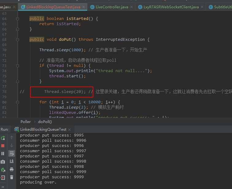 我们算下,队列在8738时步调一致,下一刻消费者跑去死循环,生产者继续工作,往队列中投入9999-8739=1260个数字。跟上面的堆内存中的队列个数可以对上。唯一一种正常结束的情况是:生产者早于消费者生产,至少同时生产,接下来某个时间要快于消费者的消费速度,最终消费者最后消费完,结束线程。换句话说,生产者的速度必须必消费者快,一旦出现消费者取到队首为null的情况,就可能陷入泥潭不可自拔。