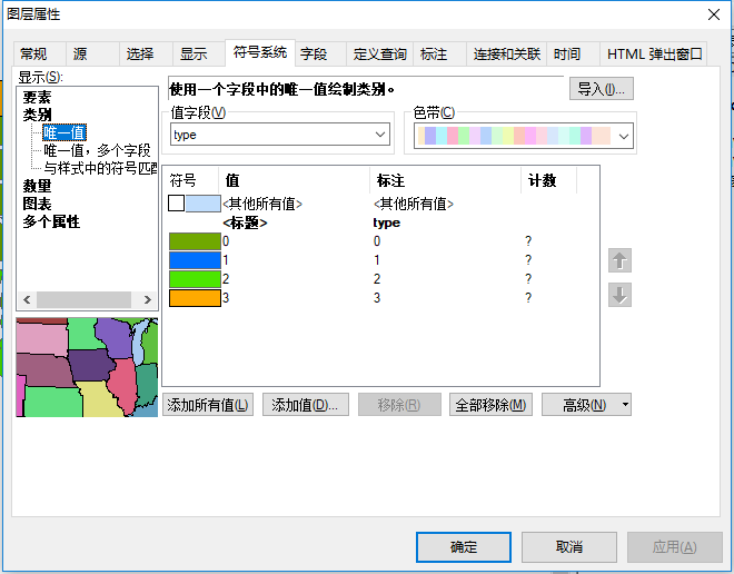 (2)road图层按照等级设置道路符号;选择road右键【属性】,选择【符号系统】选项卡,选择【类别】【唯一值】,值字段选择“类型”,设置如图4.10.3,结果如图4.10.4所示。