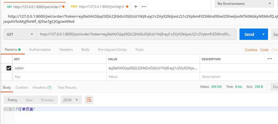 class JwtOrderView(APIView): def get(self,request,*args,**kwargs): import jwt from jwt import exceptions salt = ‘deghrtyjtdhtegjdyujhtjhrgtrjttf‘ token = request.query_params.get(‘token‘) payload = None msg = None try: payload = jwt.decode(token,salt,True) except exceptions.ExpiredSignatureError: msg = ‘token已失效‘ except jwt.DecodeError: msg = ‘token认证失败‘ except jwt.InvalidTokenError: msg = ‘非法的token‘ if not payload: return Response({‘code‘:303,‘error‘:msg}) print(payload[‘user_id‘],payload[‘username‘]) return Response(‘订单页面‘)
