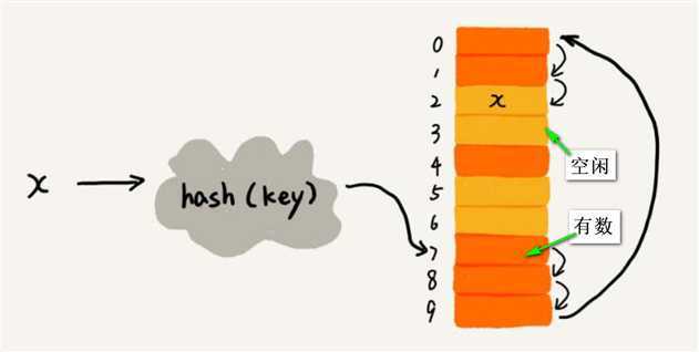 从图中可以看出,散列表的大小为10,在元素 x 插入散列表之前,已经6个元素插入到散列表中。 x 经过 Hash 算法之后,被散列到位置下标为7的位置,但是这个位置已经有数据了,所以就产生了冲突。于是就顺序地往后一个一个找,看有没有空闲的位置,遍历到尾部都没有找到空闲的位置,于是再从表头开始找,直到找到空闲位置2,于是将其插入到这个位置。