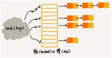 如下图所示,在散列表中,每个“桶(bucket) ”或者“槽(slot) ”会对应一条链表,所有散列值相同的元素都放到相同槽位对应的链表中。