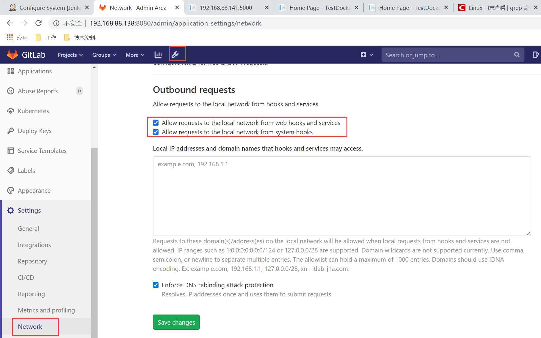进入Gitlab,点击【Admin Area】-【Network】,勾选选项后保存