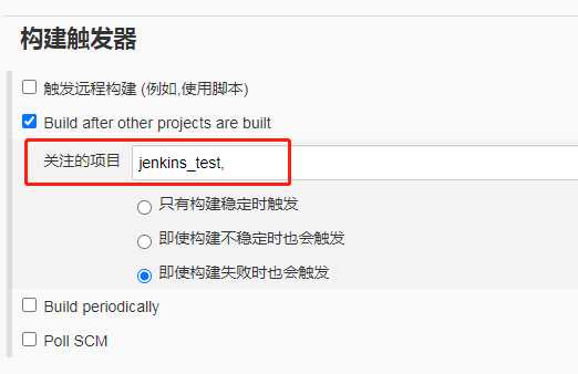 关注项目中选择先执行的项目,如jenkins_test,当jenkins_test执行后,该项目开始执行。