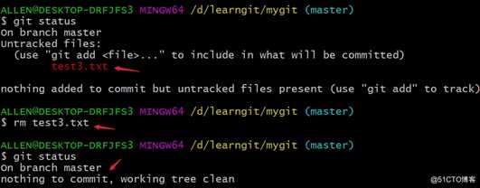 从图中可知rm命令只能删除工作区中的test3.txt,不能删除暂存区中的test3.txt;: