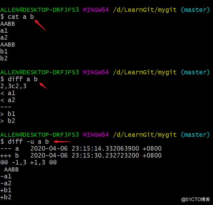 这是系统提供的比较命令,用于比较本地文件或已经提交到版本库的文件。创建文件a和文件b,使用上述指令进行比较: