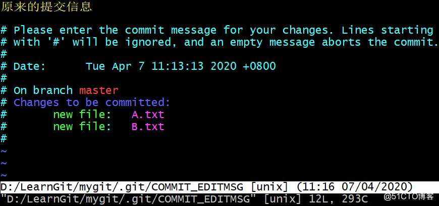 通过:wq保存并退出,随后再次进入vim编辑器,这次是修改设置了reword参数的提交的提交注释: