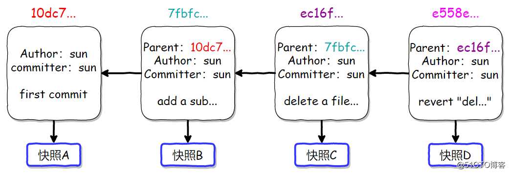 快照A~D分别表示四次提交(commit),注意提交的顺序为:A -> B -> C -> D: