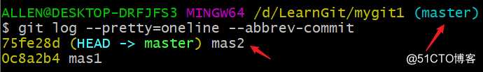 在master分支上进行新的提交:mas3,然后查看文件test.txt内容和分支提交记录: