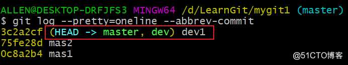 可以看到HEAD同时指向dev与master,即三个指针都指向了最新的一次提交,符合上述分析得出的结论;