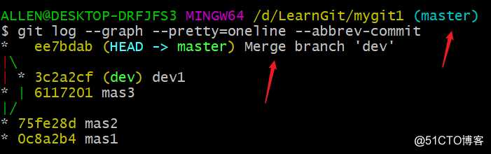 合并后,查看dev分支的提交历史: