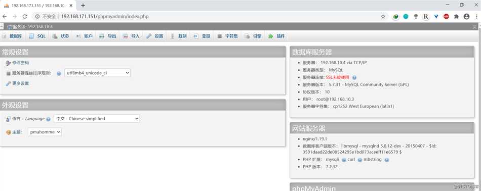 访问宿主机的IP地址+phpmyadmin进行测试(phpmyadmin就是网页根目录下的那个目录)