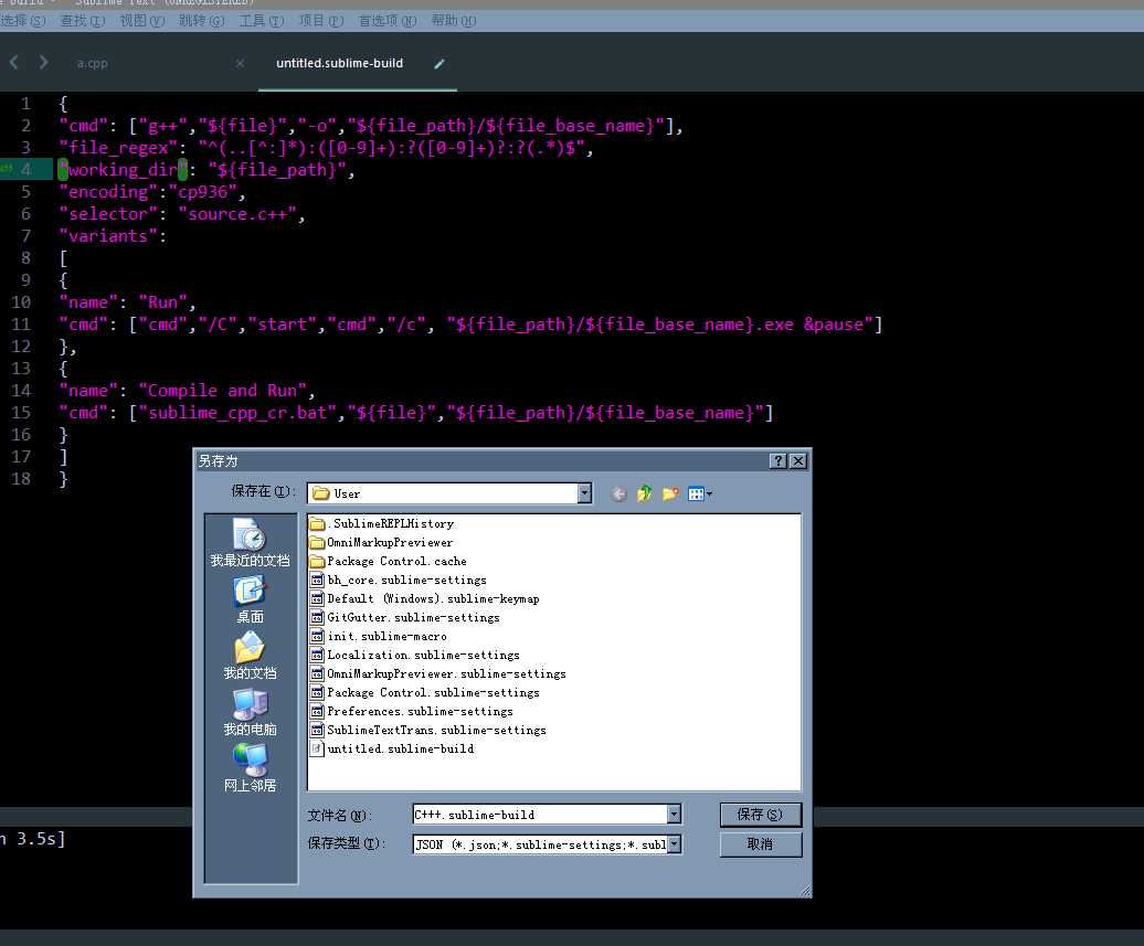 再然后打开 \(sublime\), 工具->编译系统->新建编译系统,将这段代码粘贴进去, 保存,更改文件名,改成自己喜欢的文件名即可(文件扩展名不要动,如果意外删除,扩展名是这个".sublime-build"),然后工具->编译系统->你建的那个编译系统.然后重启 \(Sublime\)
