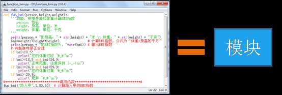 在Python中,一个扩展名为“.py”的文件就称之为一个模块。例如,创建一个名称为function_bmi.py的文件就是一个模块,如下图所示。