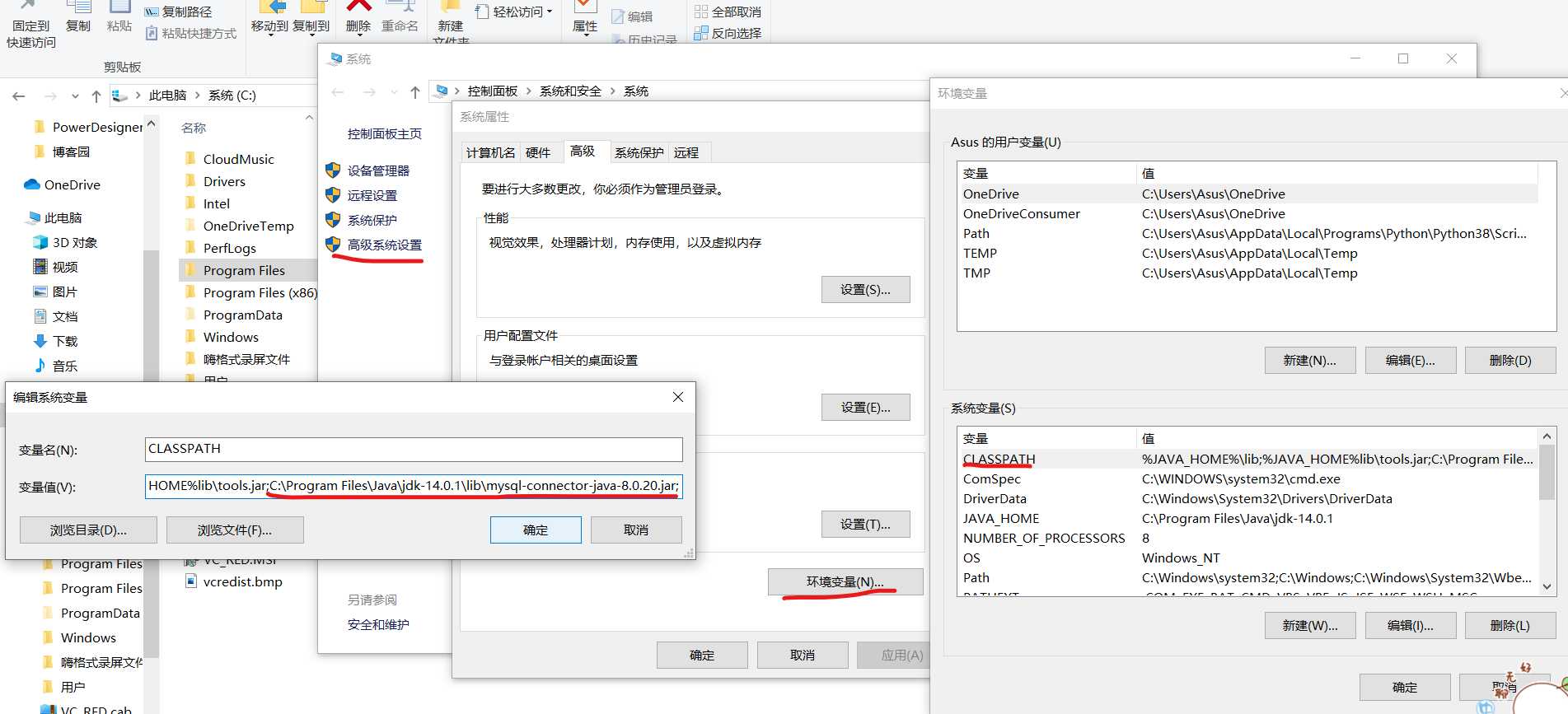 2.在高级系统设置中,配置环境变量,将驱动器路径添加到CLASSPATH路径中,如果没有的话,可以新建一个