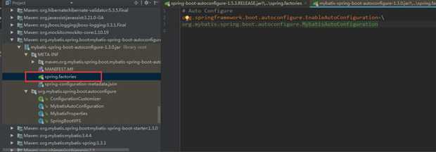 在上面的代码可以看到自动配置器会根据传入的factoryClass.getName()到项目系统路径下所有的spring.factories文件中找到相应的key,从而加载里面的类。我们就选取这个mybatis-spring-boot-autoconfigure下的spring.factories文件