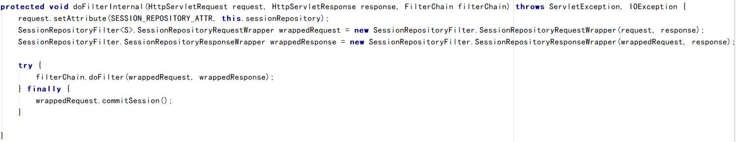 2.2、SessionRepositoryFilter的doFilterInternal方法把原生的request和response被包装成wrappedRequest和wrappedResponse,以后获取session将不再通过原生的request.session()方法而是通过wrappedRequest.getsession(),wrappedRequest.getsession()方法中重写了request.session(),wrappedRequest.getsession()的session是从SessionRepository获取得到的,做到从redis获取session