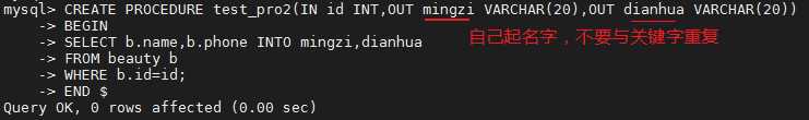 CREATE PROCEDURE storage5(IN beautyName VARCHAR(20),OUT boyName VARCHAR(20))