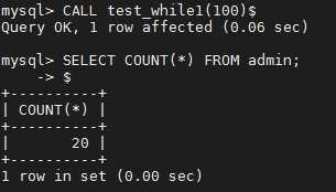 #案例:批量插入,根据次数插入到admin表中多条记录,如果次数>=20则停止。