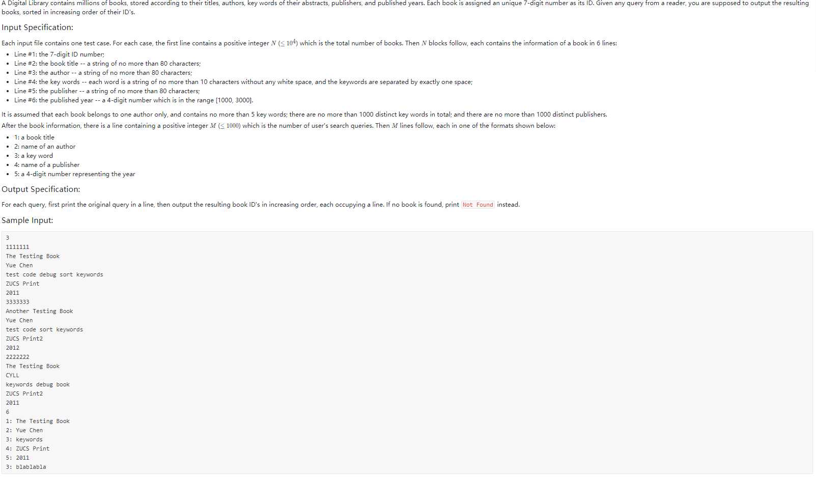 题目大意:输入一本书的各个数据,建立图书查询系统,最后对书目进行查询。