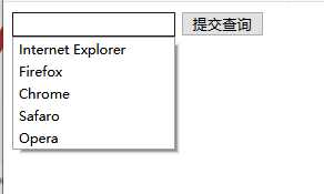 <html> <body> <!-- 表单处理程序在action属性中指定 --> <form action="action_page.php"> <input list="browsers"> <datalist id="browsers"> <option value="Internet Explorer"> <option value="Firefox"> <option value="Chrome"> <option value="Safaro"> <option value="Opera"> </datalist> <input type="submit" value="提交查询"> </form> </body> </html>