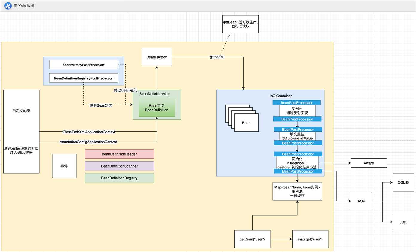 看绿色框框住的部分. 这个含义是: 通过不同的工具, 可能是xmlApplicationContext, 可能是annotationApplicationContext工具 读取的配置, 最后都会构造成BeanDefinition对象. 然后将BeanDefinition传递给BeanFactory, BeanFactory统一处理BeanDefinition对象, 调用getBean()方法, 将其放入IoC容器中.