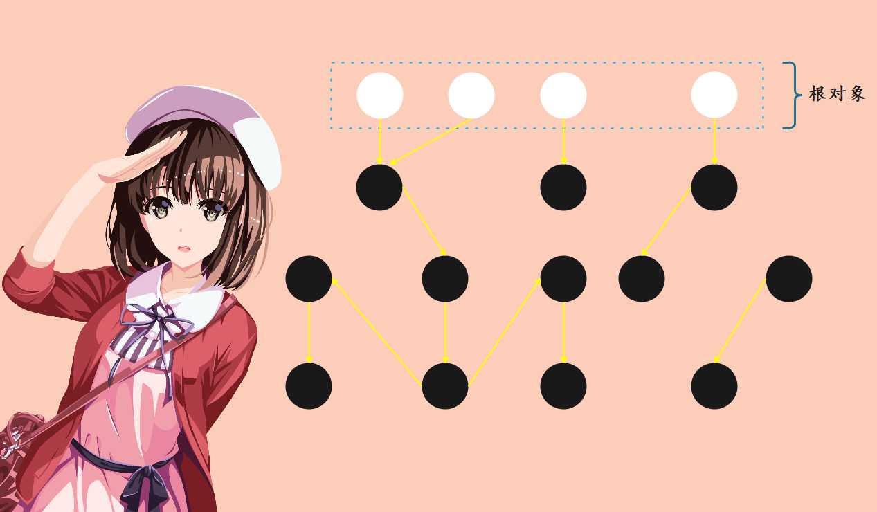 寻找根对象(root object)的集合,所谓的root object就是一些全局引用和函数栈的引用。这些引用所用的对象是不可被删除的,而这个root object集合也是垃圾检测动作的起点从root object集合出发,沿着root object集合中的每一个引用进行探索,如果能到达某个对象A,则称A是可达的(reachable),可达的对象也不可被删除。这个阶段就是垃圾检测阶段当垃圾检测阶段结束后,所有的对象分为了可达的(reachable)和不可达的(unreachable)。而所有可达对象都必须予以保留,而不可达对象所占用的内存将被回收我们通过几张图来简单描述一下: