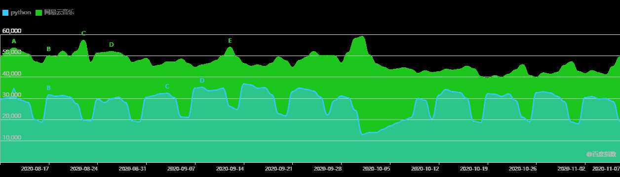 有“上班曲线”,那就一定有“休息曲线”。加入王者荣耀与python对比,发现在搜索量上,二者确实是错峰的。虽然搜索“王者荣耀”并不等于人们就是在玩它,但二者应该是正相关的,百度“王者荣耀”无非是看游戏更新动态、看论坛、角色出装之类的,这些浏览行为也是为了更好地玩耍。
