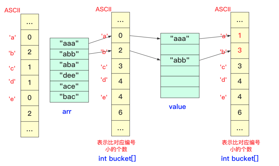 我们在进行收集的时候需要再次遍历arr,但我们需要一个临时数组String value[]储存结果(因为arr没遍历完后面不能使用),而进行遍历的规则就是:遍历arr时候对应字符串str,该位字符对应bucket[str.charAt(i)]桶中数字就是要放到arr中的编号(多少个比它小的就放到第多少位),放置之后要对bucket当前位自增(因为下一个这个位置字符串要把这个str考虑进去)。这样到最后即可完成排序。