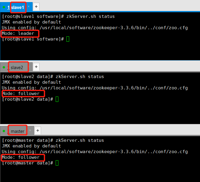 三台机器,slave1 成功的通过了选举称为了leader,而剩下的两台成为了 follower。这时候,如果你将slave1关掉,会发现剩下两台又会有一台变成了 leader节点。