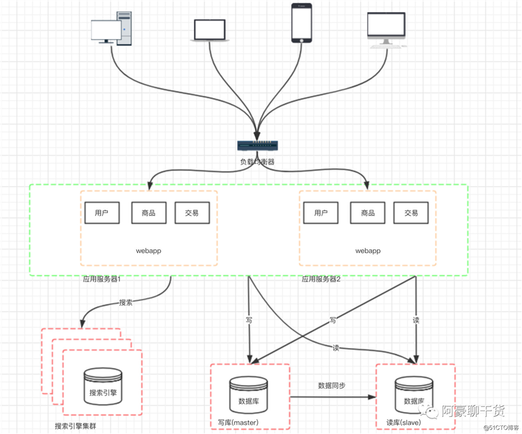 架构演变到上面的阶段,并不是终点。通过上面的设计,应用层的性能被我们拉上来了, 但数据库的负载也在逐渐增大,那如何去提高数据库层面的性能呢?有了前面的设计思路以后,我们自然也会想到通过增加服务器来提高性能。但假如我们单纯的把数据库一分为二,然后对于数据库的请求,分别负载到两台数据库服务器上,那必定会造成数据库数据不统一的问题。 所以我们一般先考虑将数据库读写分离。