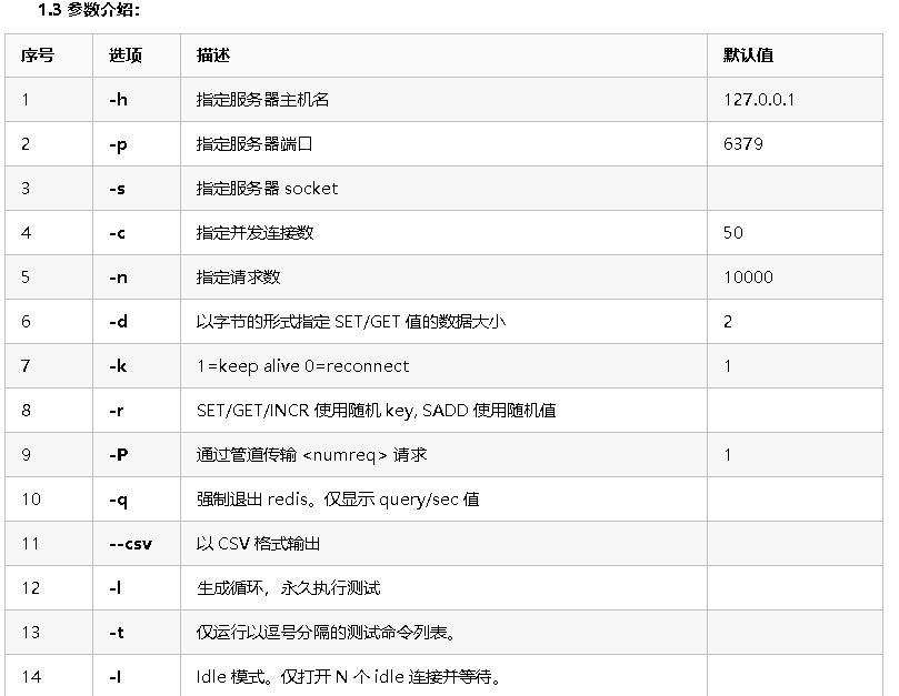 redis-benchmark [-h ] [-p ] [-c ] [-n <requests]> [-k ]