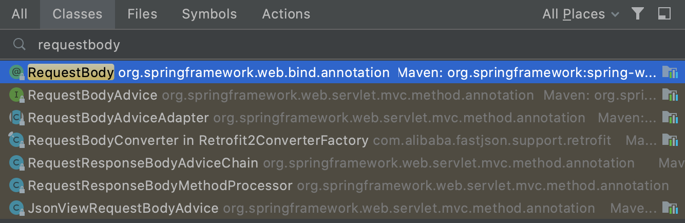 可以在 IDEA 搜索类 RequestBody,得到与之相关的几个类如下图所示: