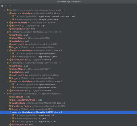 在可能实现类的 public 方法入口打上断点,然后单步调试。可以找到入口方法是 RequestResponseBodyMethodProcessor.resolveArgument 。这个方法进一步调用了方法 AbstractMessageConverterMethodArgumentResolver.readWithMessageConverters , 该方法会拿到若干个 HttpMessageConverter 的实现类(如下图所示),判断其中是否有可以处理请求对象 InputMessage 的类。只要任一能处理即可。