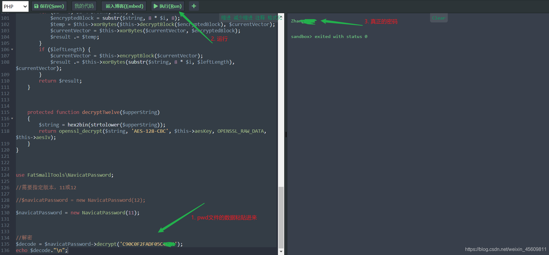 <?php namespace FatSmallTools; class NavicatPassword { protected $version = 0; protected $aesKey = ‘libcckeylibcckey‘; protected $aesIv = ‘libcciv libcciv ‘; protected $blowString = ‘3DC5CA39‘; protected $blowKey = null; protected $blowIv = null; public function __construct($version = 12) { $this->version = $version; $this->blowKey = sha1(‘3DC5CA39‘, true); $this->blowIv = hex2bin(‘d9c7c3c8870d64bd‘); } public function encrypt($string) { $result = FALSE; switch ($this->version) { case 11: $result = $this->encryptEleven($string); break; case 12: $result = $this->encryptTwelve($string); break; default: break; } return $result; } protected function encryptEleven($string) { $round = intval(floor(strlen($string) / 8)); $leftLength = strlen($string) % 8; $result = ‘‘; $currentVector = $this->blowIv; for ($i = 0; $i < $round; $i++) { $temp = $this->encryptBlock($this->xorBytes(substr($string, 8 * $i, 8), $currentVector)); $currentVector = $this->xorBytes($currentVector, $temp); $result .= $temp; } if ($leftLength) { $currentVector = $this->encryptBlock($currentVector); $result .= $this->xorBytes(substr($string, 8 * $i, $leftLength), $currentVector); } return strtoupper(bin2hex($result)); } protected function encryptBlock($block) { return openssl_encrypt($block, ‘BF-ECB‘, $this->blowKey, OPENSSL_RAW_DATA|OPENSSL_NO_PADDING); } protected function decryptBlock($block) { return openssl_decrypt($block, ‘BF-ECB‘, $this->blowKey, OPENSSL_RAW_DATA|OPENSSL_NO_PADDING); } protected function xorBytes($str1, $str2) { $result = ‘‘; for ($i = 0; $i < strlen($str1); $i++) { $result .= chr(ord($str1[$i]) ^ ord($str2[$i])); } return $result; } protected function encryptTwelve($string) { $result = openssl_encrypt($string, ‘AES-128-CBC‘, $this->aesKey, OPENSSL_RAW_DATA, $this->aesIv); return strtoupper(bin2hex($result)); } public function decrypt($string) { $result = FALSE; switch ($this->version) { case 11: $result = $this->decryptEleven($string); break; case 12: $result = $this->decryptTwelve($string); break; default: break; } return $result; } protected function decryptEleven($upperString) { $string = hex2bin(strtolower($upperString)); $round = intval(floor(strlen($string) / 8)); $leftLength = strlen($string) % 8; $result = ‘‘; $currentVector = $this->blowIv; for ($i = 0; $i < $round; $i++) { $encryptedBlock = substr($string, 8 * $i, 8); $temp = $this->xorBytes($this->decryptBlock($encryptedBlock), $currentVector); $currentVector = $this->xorBytes($currentVector, $encryptedBlock); $result .= $temp; } if ($leftLength) { $currentVector = $this->encryptBlock($currentVector); $result .= $this->xorBytes(substr($string, 8 * $i, $leftLength), $currentVector); } return $result; } protected function decryptTwelve($upperString) { $string = hex2bin(strtolower($upperString)); return openssl_decrypt($string, ‘AES-128-CBC‘, $this->aesKey, OPENSSL_RAW_DATA, $this->aesIv); } } use FatSmallTools\NavicatPassword; //需要指定版本,11或12 11查不到就用12 //$navicatPassword = new NavicatPassword(12); $navicatPassword = new NavicatPassword(11); //解密 $decode = $navicatPassword->decrypt(‘4853367EA495‘); echo $decode."\n";
