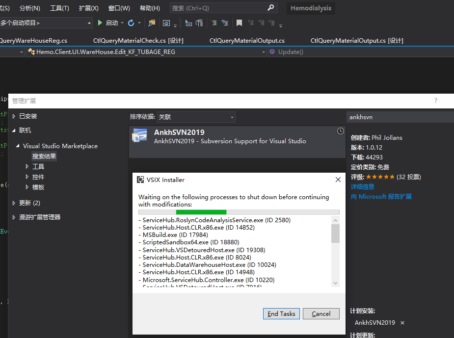 以VS2019为例,点击拓展,管理拓展,在弹出的窗体中搜索ankhsvn,然后点击详细信息去官网下载出现如上界面即可。