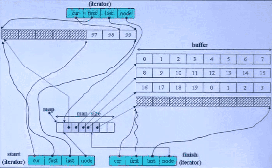 map 作为主控。这个 map 是一小块连续空间(默认初值大小8个节点),其中每个节点都是指针,指向另一段(较大的)连续线性空间,称为缓冲区。缓冲区才是deque的存储空间主体。map提供的节点不足,就必须重新配置一个更大的一块map(至少两倍+2)。并将原来的数据放在中央,以使头尾两端的扩充能量一样大。