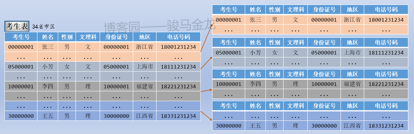 例如本文的示例中,按照考生所属地区对考生表进行水平切分,这是按照字段条件进行切分。