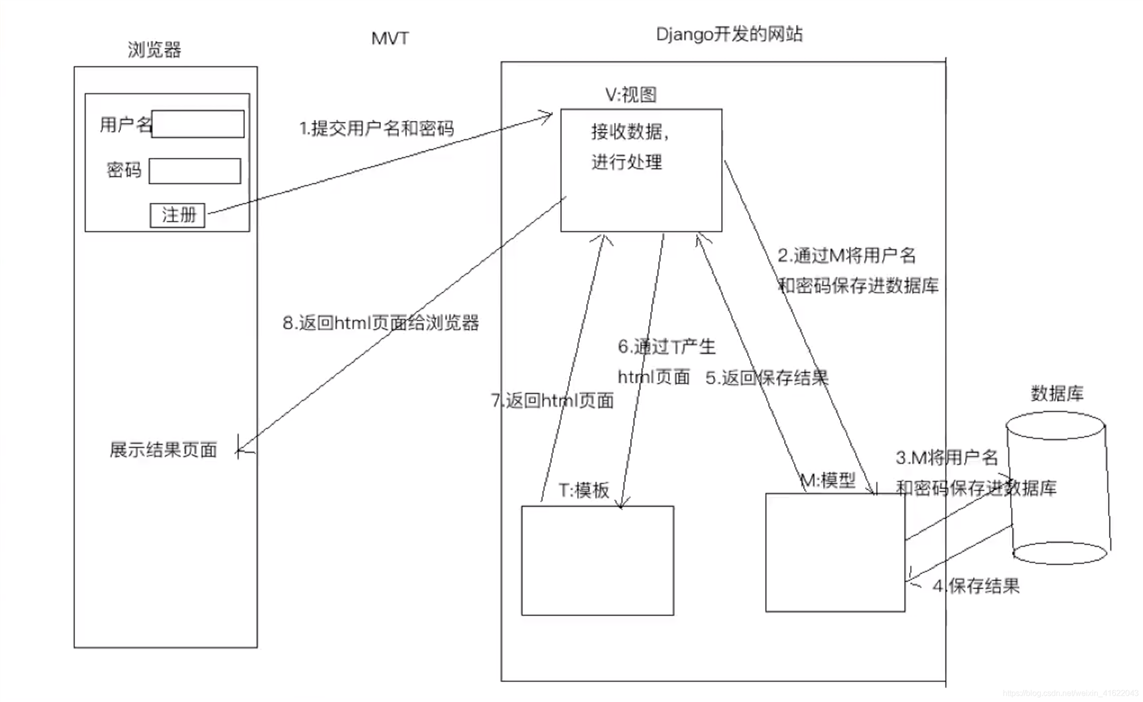 T 代表模板 (Template):负责如何把页面展示给用户(html)。