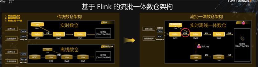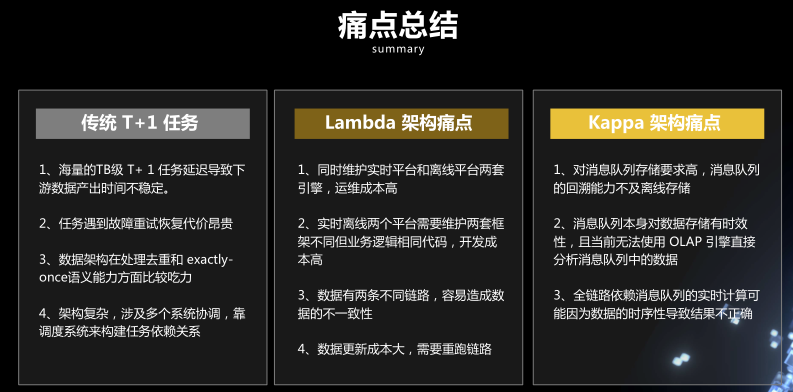 那么在这一块,传统的架构主要存在的问题就是这种割裂的数仓搭建这会造成很多重复工作,重复的资源消耗,并且实时、离线底层数据模型不一致,会导致数据一致性和质量难以保障。