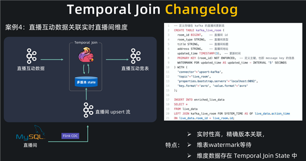 刚刚的场景有了更简洁的解决方案,我们可以通过 Flink CDC connector 把直播间数据库表的 changelog 同步到 Kafka 中,注意我们看下右边这段 SQL,我们用了 upsert-kafka connector 来将 MySQL binlog 写入了 Kafka,也就是 Kafka 中存放了直播间变更数据的 upsert 流。然后我们将互动数据 temporal join 这个直播间 upsert 流,便实现了直播数据打宽的功能。