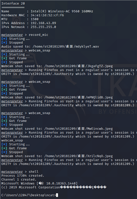 4、使用MSF meterpreter(或其他软件)生成获取目标主机音频、摄像头、击键记录等内容,并尝试提权 (2分)