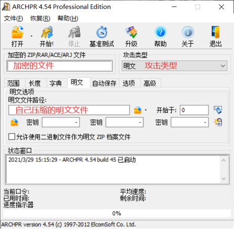 用ARCHPR爆破工具攻击类型选择明文,加载加密文件和我们压缩的明文文件