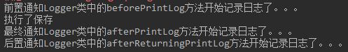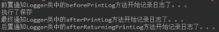 @Component("logger") @Aspect//表示当前类是一个切面类public class Logger { @Pointcut("execution(* com.itheima.service.impl.*.*(..))") private void pt1(){} //前置通知 @Before("pt1()") public void beforePrintLog(){ System.out.println("前置通知Logger类中的beforePrintLog方法开始记录日志了。。。"); } //后置通知 @AfterReturning("pt1()") public void afterReturningPrintLog(){ System.out.println("后置通知Logger类中的afterReturningPrintLog方法开始记录日志了。。。"); } // 异常通知 @AfterThrowing("pt1()") public void afterThrowingPrintLog(){ System.out.println("异常通知Logger类中的afterThrowingPrintLog方法开始记录日志了。。。"); } //最终通知 @After("pt1()") public void afterPrintLog(){ System.out.println("最终通知Logger类中的afterPrintLog方法开始记录日志了。。。"); } }